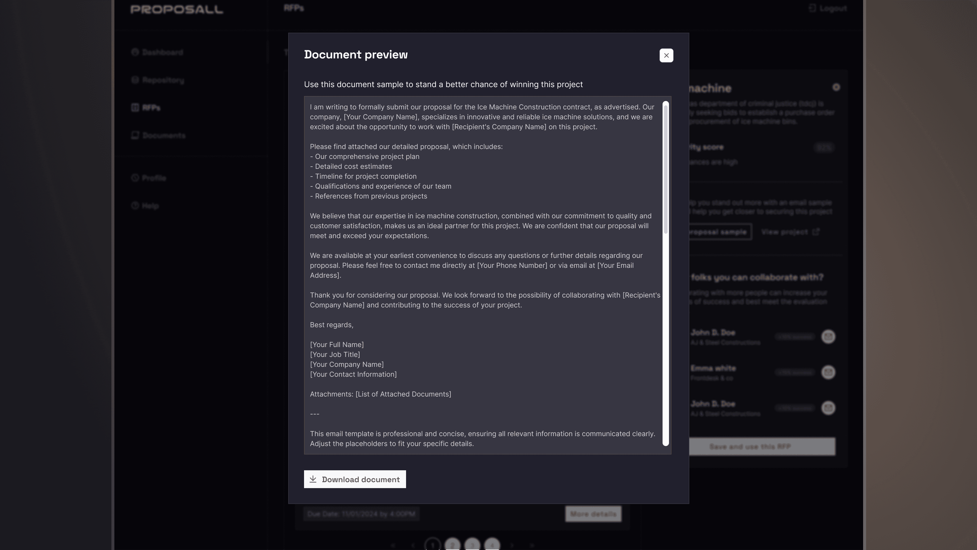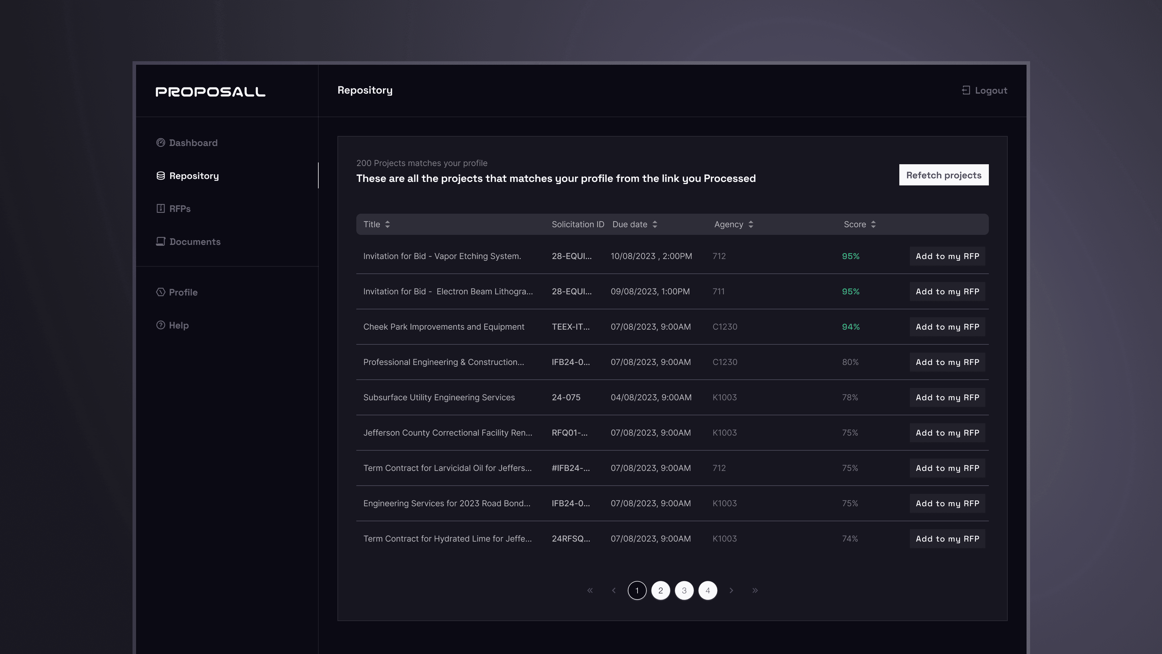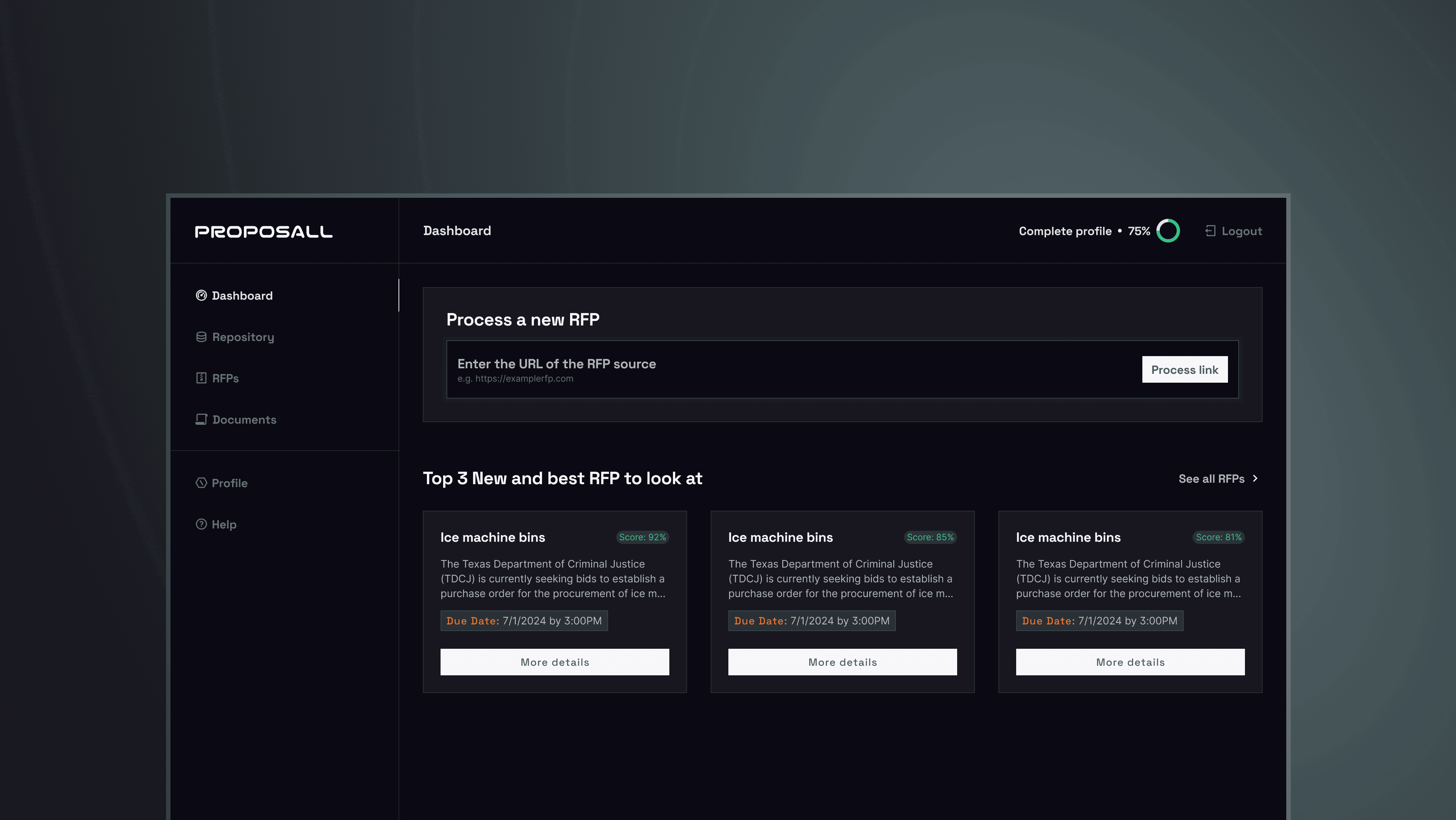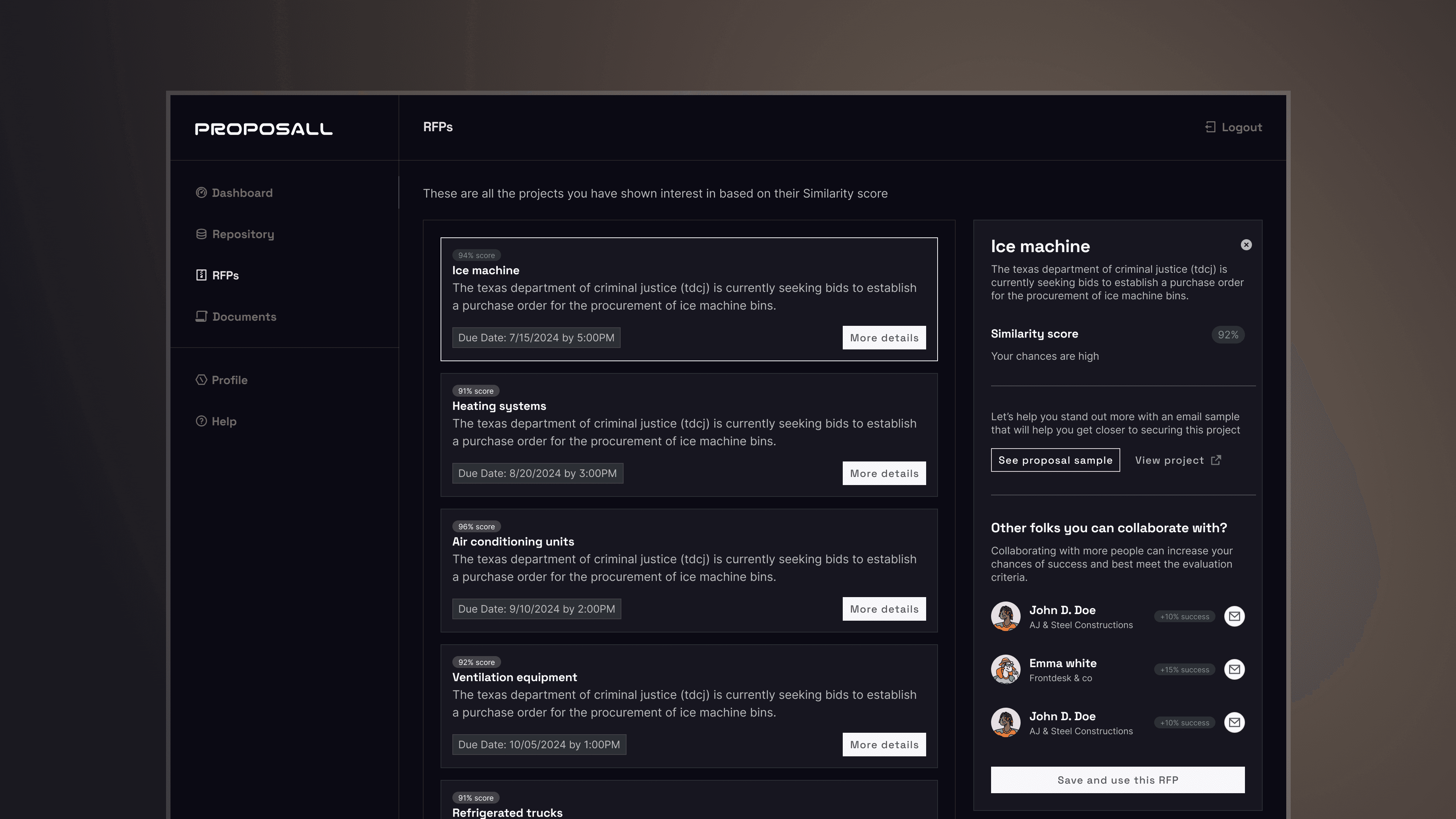 Proposall helps businesses quickly find projects that match their profile from large public bid databases. It shortens the research-to-proposal process and quietly uses AI to identify ideal fits and draft proposal starters.