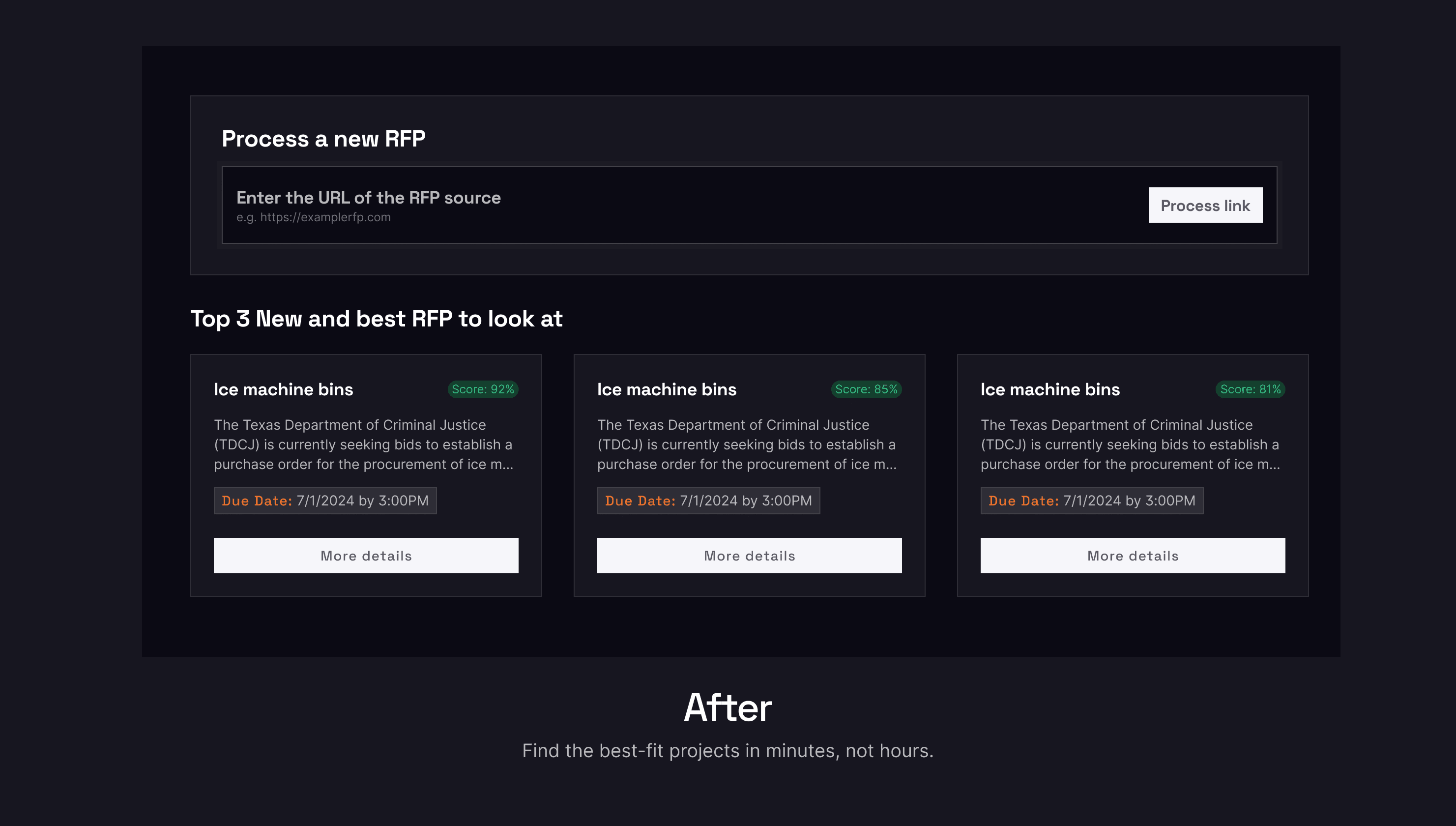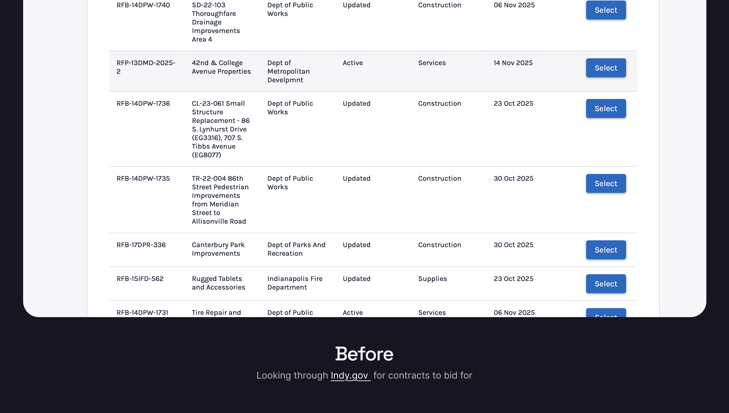 Businesses spend hours browsing sites like SAM.gov or Indy.gov just to find relevant contracts. By the time they evaluate and prepare proposals, deadlines pass, or they apply for poor-fit projects out of pressure.